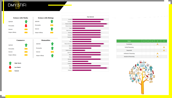 Dmystifi provides standardized psychometric tests to evaluate a person’s skills and abilities through a range of Interest, Personality and Aptitude tests. The combination of Interest, personality and Aptitude tests can help determine the right stream & subjects after 10 th and recommend best suited career options after 12 th .